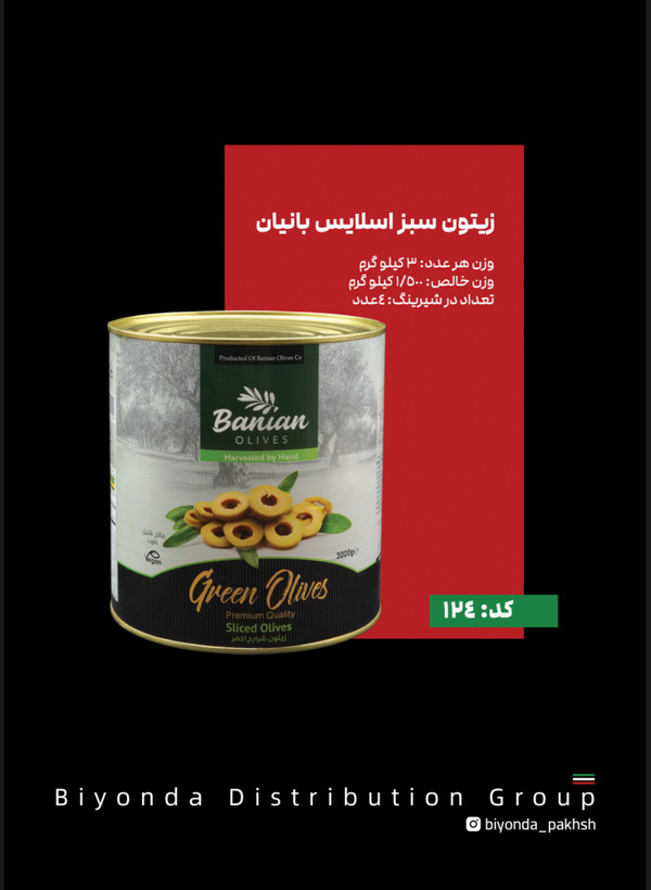 نمونه ای دیگر از خوش طعم ترین و دلنشین ترین نوع زیتون،زیتون سبز اسلایس است، که برند بانیان خیلی تخصصی و و هوشمندانه توانسته این نوع از زیتون را تولید و عرضه کند.