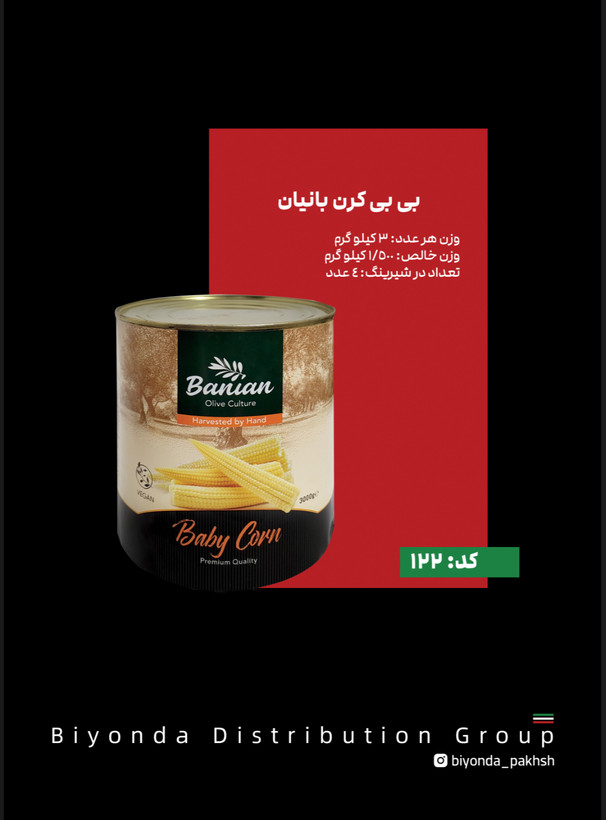 بی بی کرن(یا درواقع ذرت کوچک) محصولی که به شدت میتونه طعم متفاوت و دلنشین رو به سالاد رستوران یا خونه ی شما بده.بی بی کرن در انواع و طعم های مختلف به بازار عرضه میشه اما مابین تمامی نوع های مختلف، برند بانیان توانسته محصولی باکیفیت، خوش طعم وبا سایز های مناسب تولید و عرضه کنه.